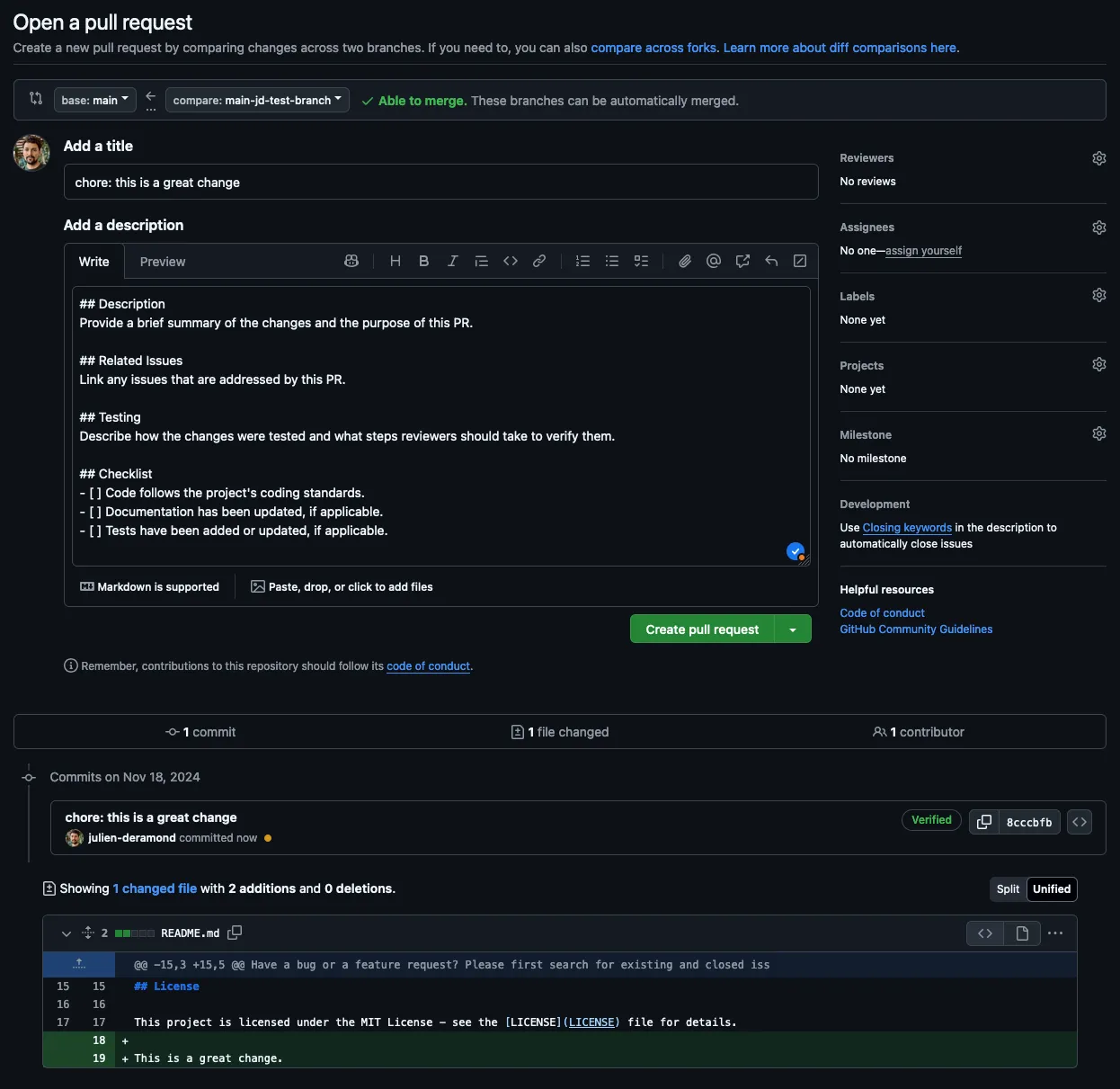 3. Commit the file to your repository. Contributors will now see this template whenever they create a PR.